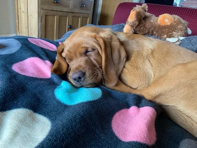 We were over the moon when we found out that we’d be able to have one of the girls and we followed the Facebook videos and updates closely, really feeling part of the process. Collection day finally came and we were soon travelling home with a happy, healthy, confident and utterly beautiful fox-red puppy. Meanwhile, Carol has always been on hand to answer any questions and offer expert advice.